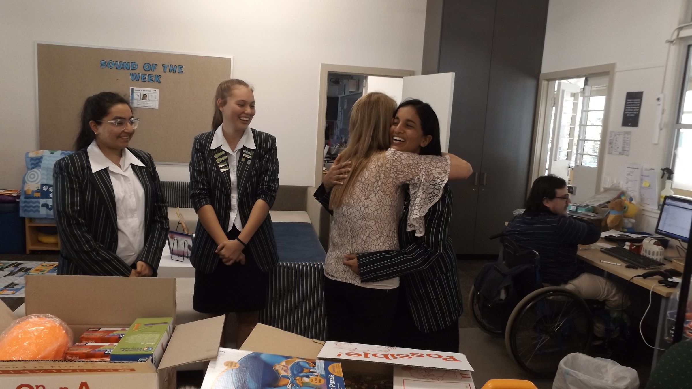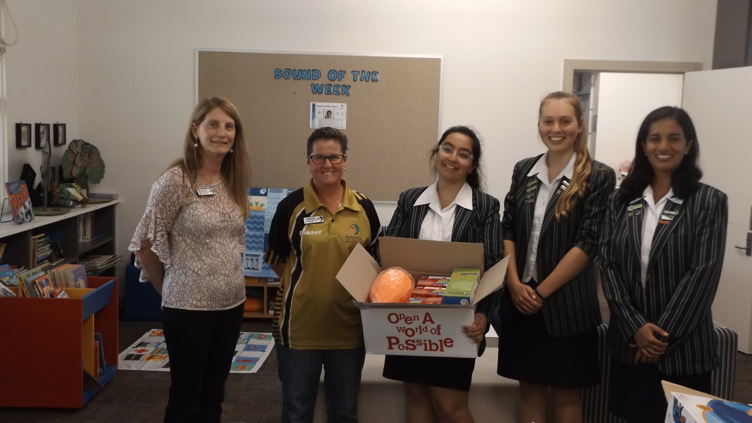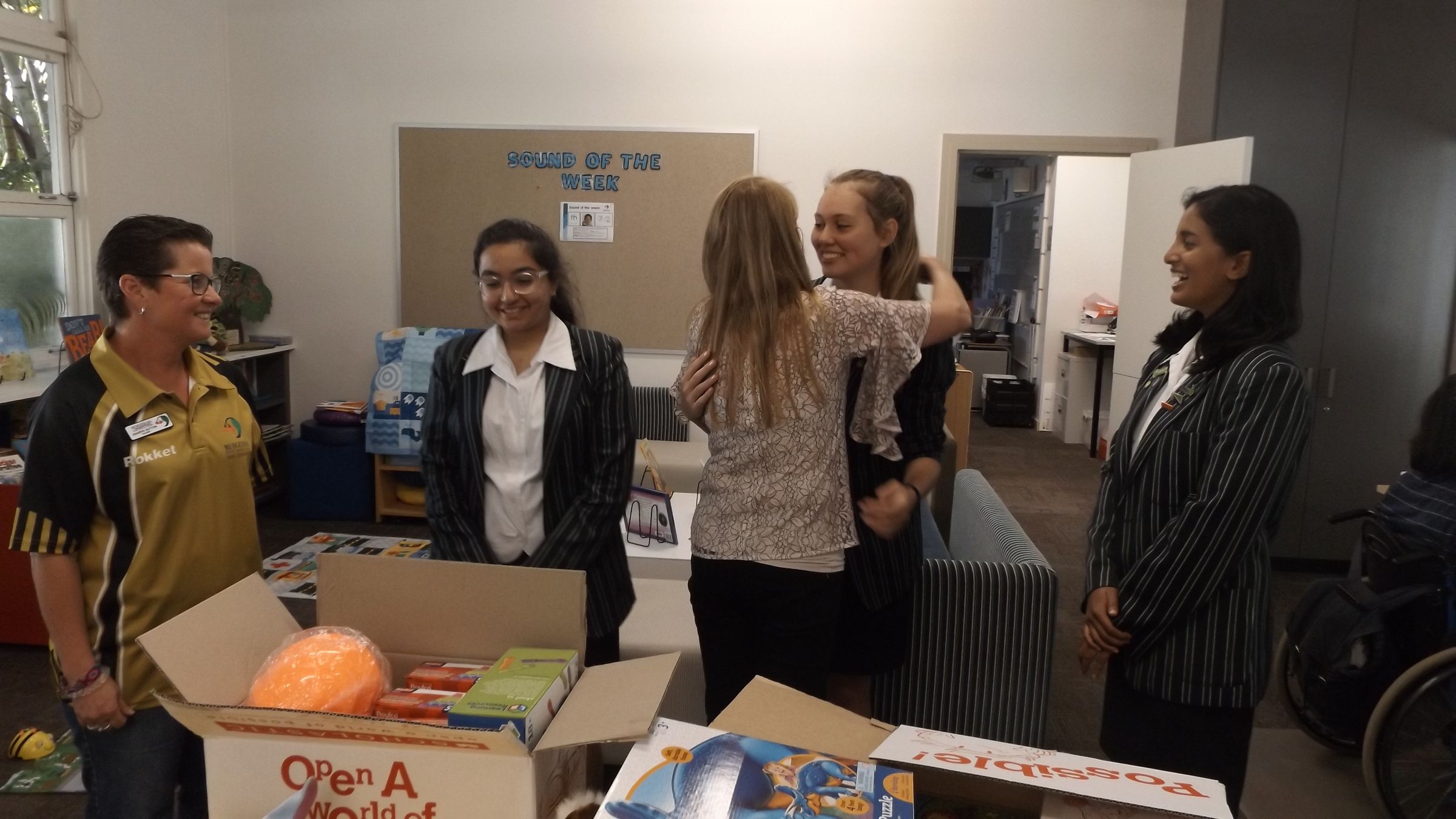 Three representatives from our Bibliotheca Committee; Shay, Joanne and Emmanuelle (Year 11) visited the kids at Mudgeeraba Special School with three big boxes of gifts this week. Commissions from our recent Scholastic Book Fair enabled us to purchase $500 worth of toys, books, games and sports equipment to support our Service Learning Programme, Mudgee Kids, in addition to our $2000 donation to the Room to Read organisation.