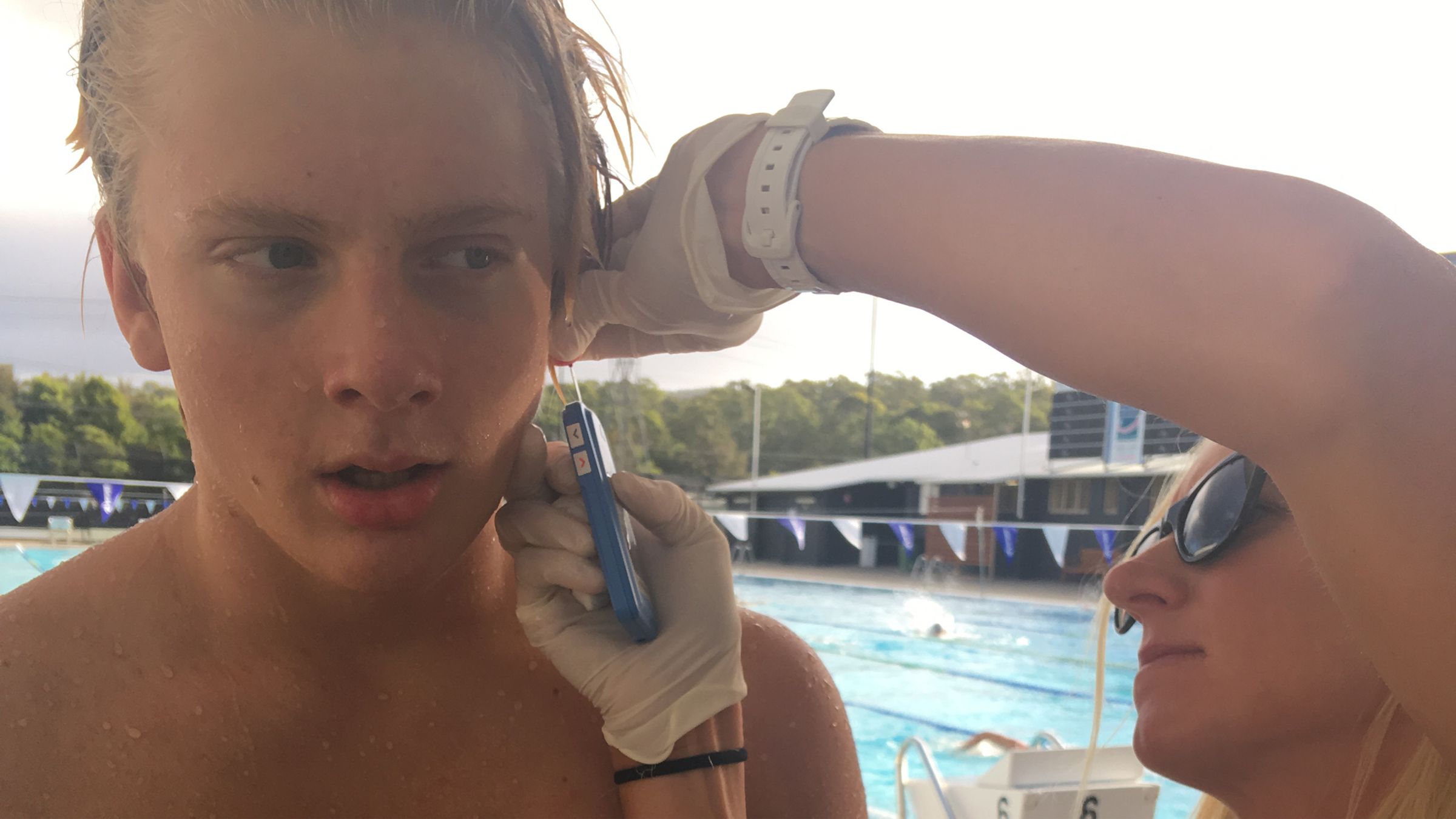 Harrison Smith (recently crowned Queensland Champion 50m and 100m breaststroke) having his blood lactate levels tested by Dr Annette Eastwood, Somerset Exercise Physiologist. This is part of the ongoing work Dr Eastwood is doing to provide our elite athletes with feedback and information rarely available to athletes outside a Sports Institute.