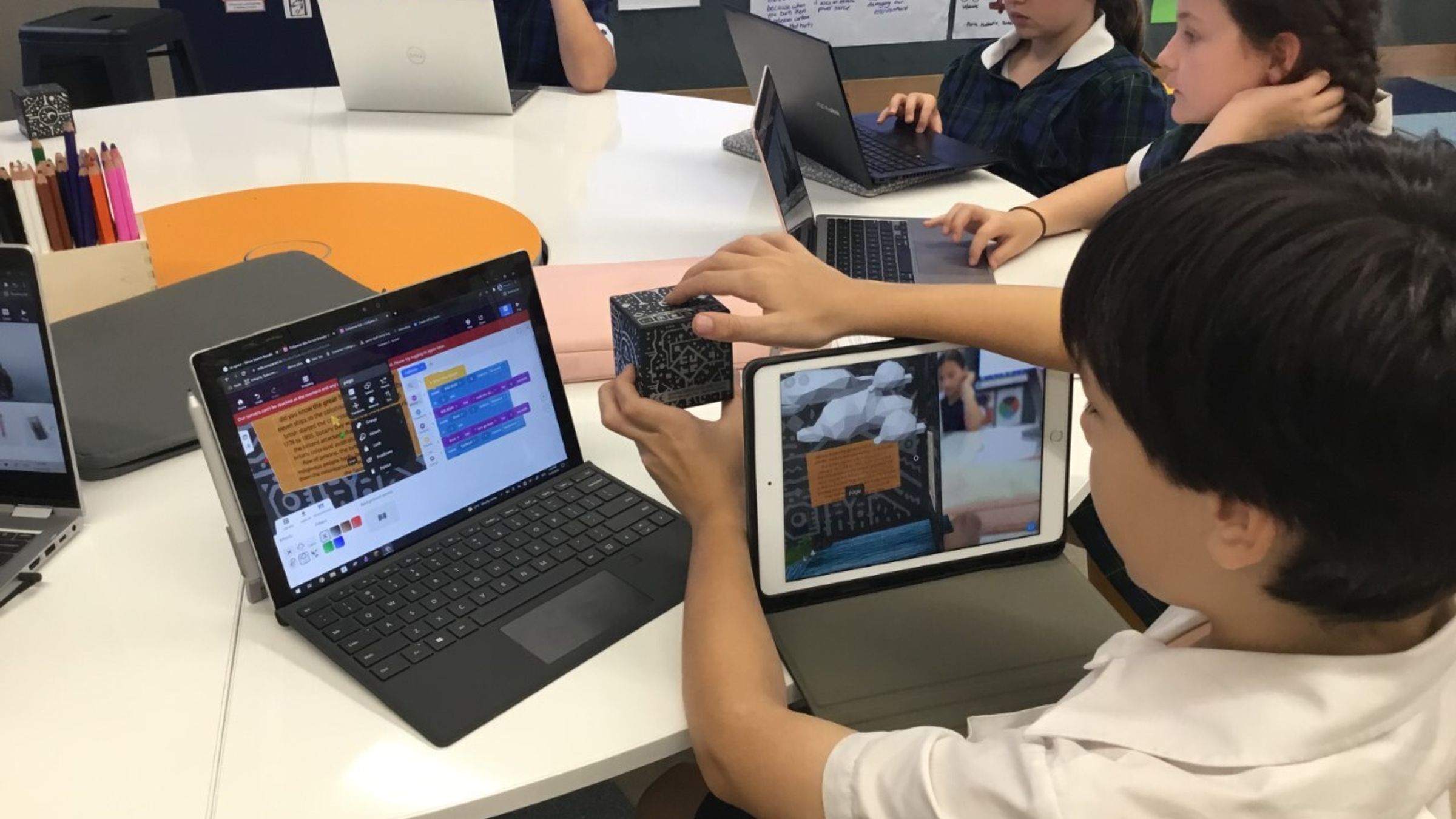 Year 4 students are creating their own interactive multiple choice game using Scratch Game Creator software, with Year 5 continuing the programming theme for this term using Co Spaces to create an interactive game connected to their Central Idea Historical influences shape a community. Students are particularly excited to gain hands on experience using the Augmented Reality Merge Cubes, this allowing student to bring their game creations to life.