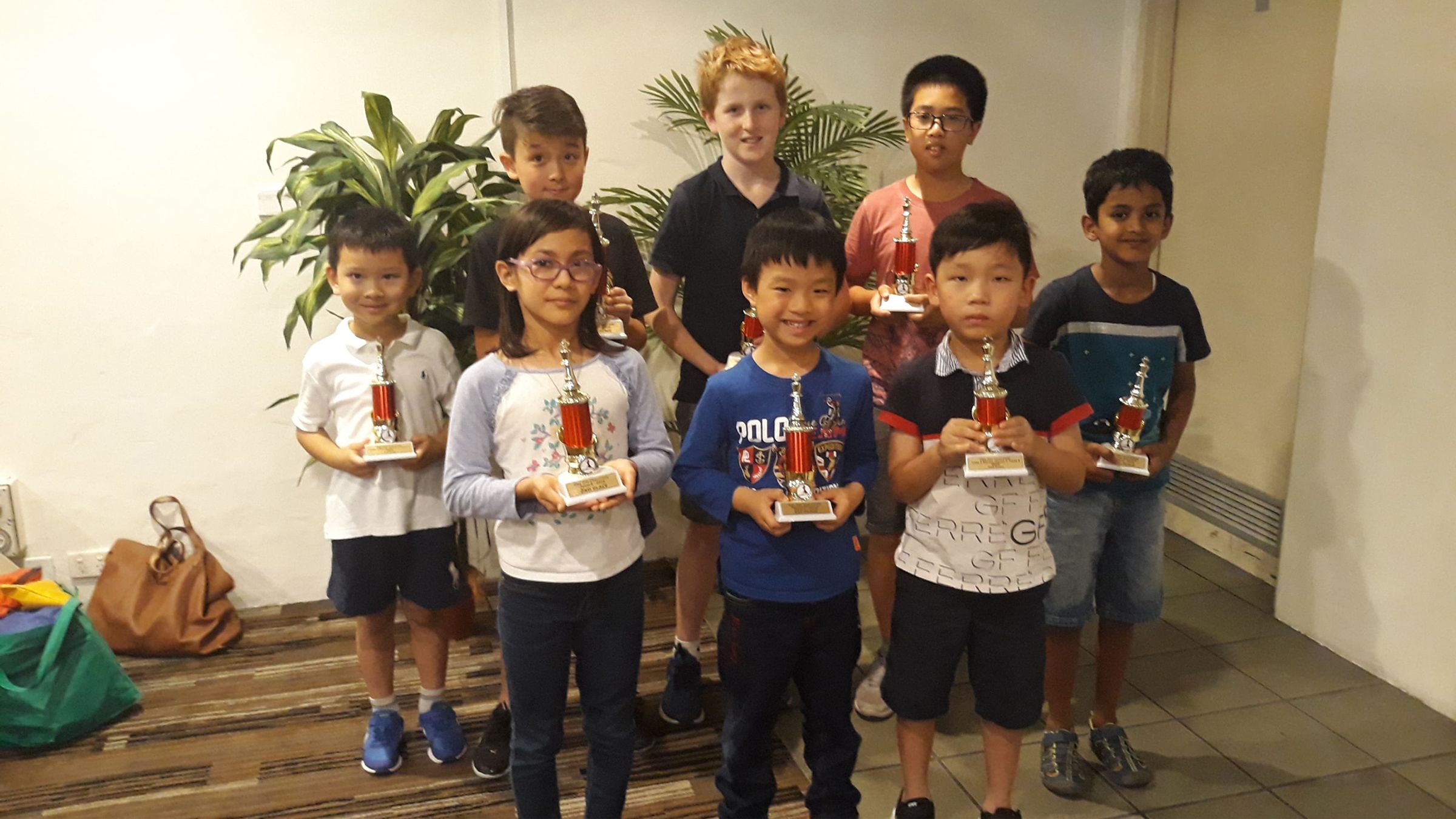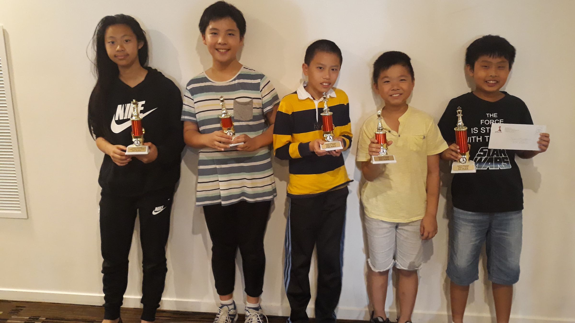 Year 1 student Calen Tang had an excellent 5.5/8, 9th place and winning the trophy for first Rating Group A. When Calen and Kona played each other in round 7, they were leading the whole field of 75 with 5.5/6. Sasha Hanford scored 5/8 and earned 3rd Rating Group A.
