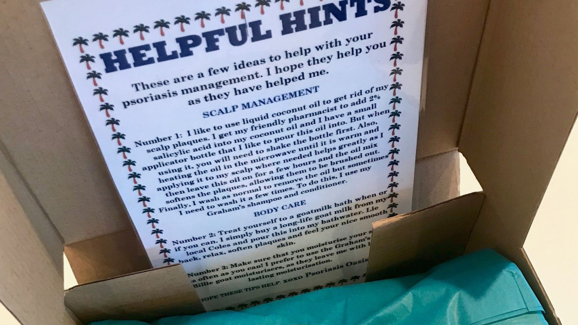 When we think of an Oasis, Psoriasis is not often a word we associate with it. In fact, usually they could be deemed as direct contradictions to one and other but I wanted to change this idea one small gift box at a time. My personal connection to the project meant that I put my heart and soul into every detail of its construction and the name Psoriasis Oasis gave me a sense of empowerment, knowing that my one kind gesture would bring a little peace of paradise to those whom I know have dealt with something that is so often ignored as a superficial ailment. When in reality, psoriasis is much more than that; it’s often instead a drain of positivity and self-confidence. But enough is enough; and that is why the focus of my Personal Project is to restore a sense of normality to fellow sufferers to bring to them the feelings of happiness one might feel on a tropical island, right in the comfort of their own home. I’ve come to learn that my project defies the stereotypes of this condition just through its name and that was the first step in my journey as a humanitarian. At its near completion, my product is now being donated all around the country through my interaction with Facebook and Instagram users accessing my Psoriasis Oasis accounts; teaching me how to communicate with total strangers on a shared issue. Again, the relationships that I have developed as a result of this will be remembered forever; meeting with the clients has solidified the importance of my endeavour and proven that Psoriasis needs to be discussed frequently because it doesn’t discriminate.