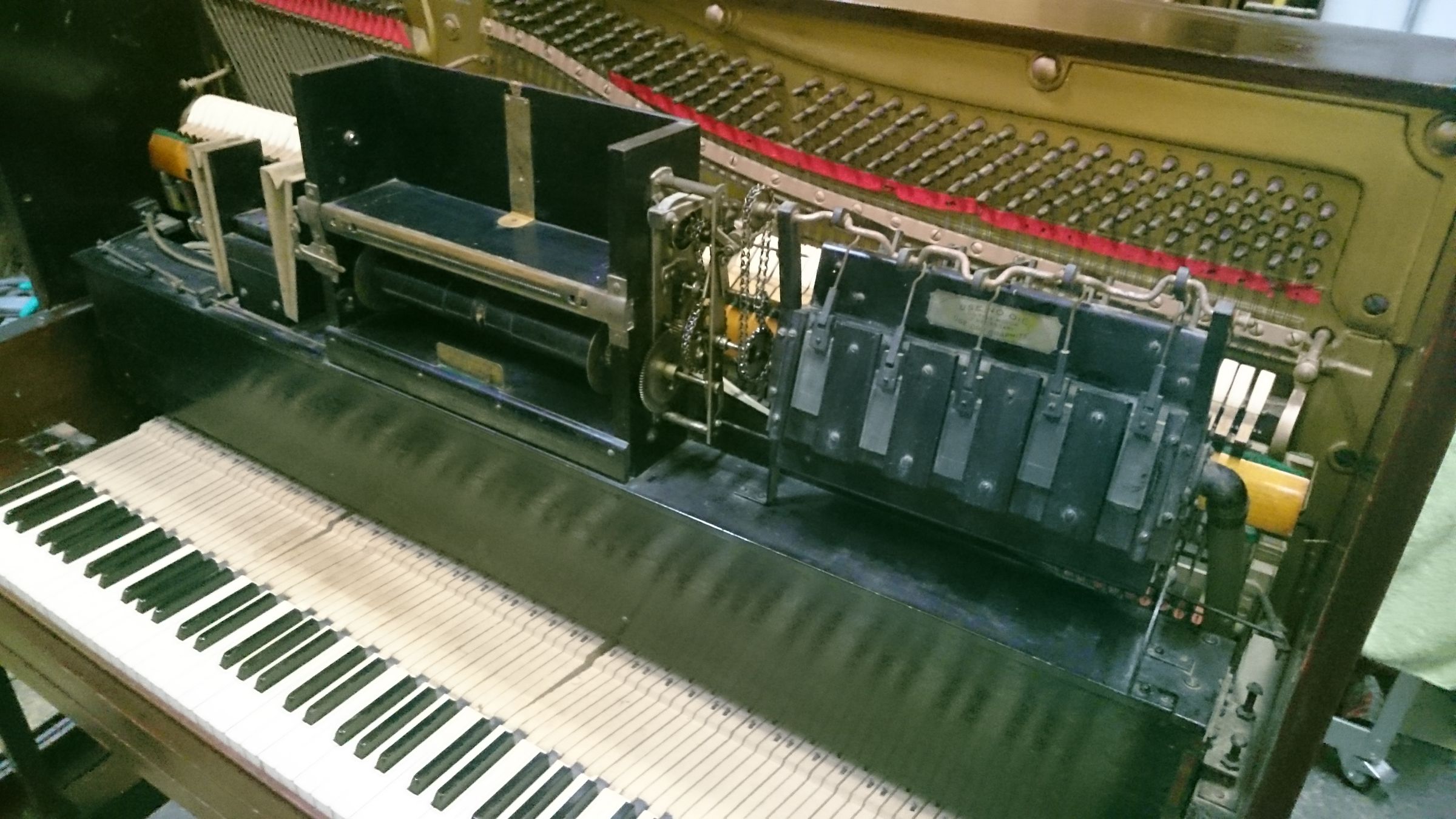 Essentially, a pianola will look like an ordinary piano from the outside, but on the inside are many complex mechanisms which use perforated paper rolls to play virtually any song, provided you have the roll for it.