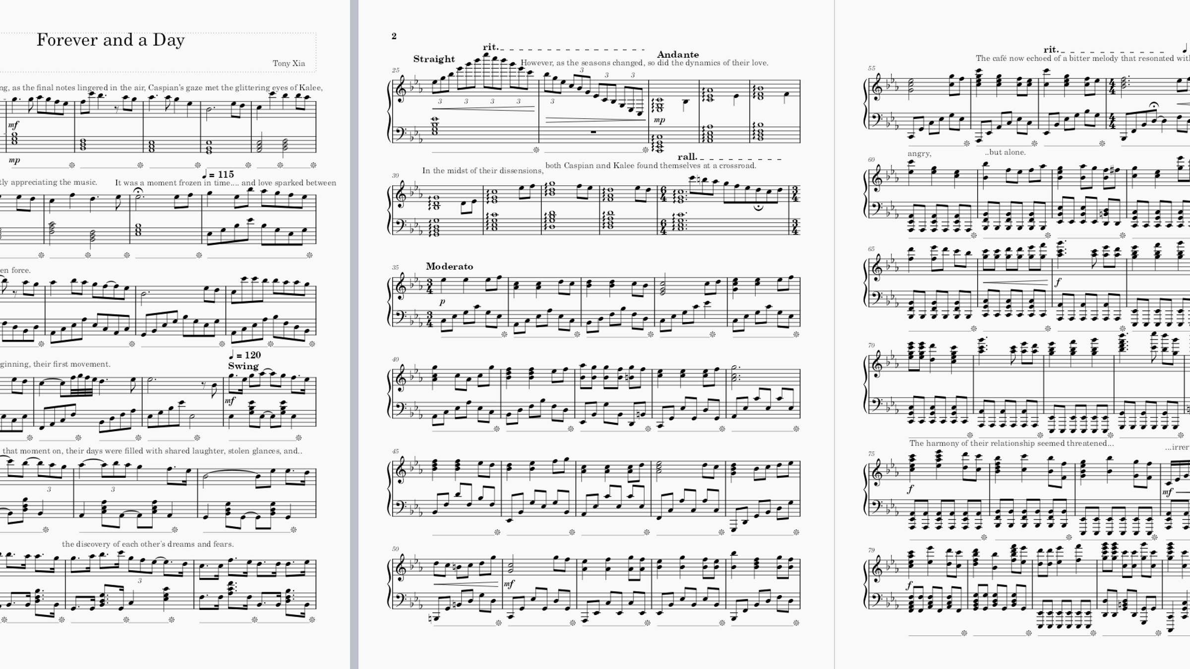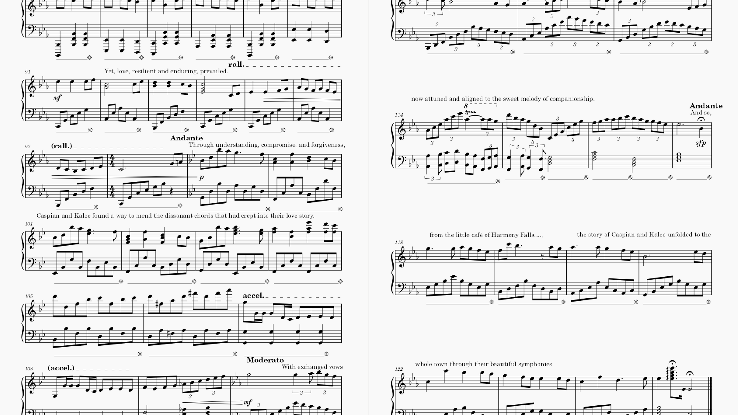 My story consisted of a romantic relationship between Caspian and Kalee set within a small town called “Harmony Falls”. From their love at first sight, to arguments occurring and eventually resolving their conflicts, I have attempted to capture this staggering storyline within my composed piece through musical techniques such as varying tempo and change of tonality.
