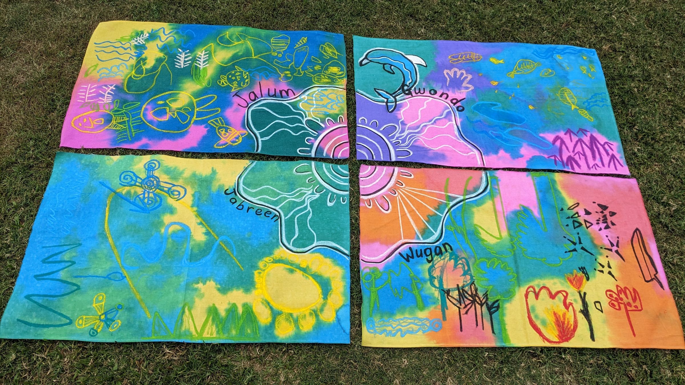 At the centre of our mural, there is a meeting place with people of different sizes around it, just like at school. Then a songline travels across all stories, joining them. From the songline, paths lead to the meeting place: water paths for stories where water plays an important part (Gwondo, Jabreen and Jalum) and a land path when the story takes place on land (Wugan).