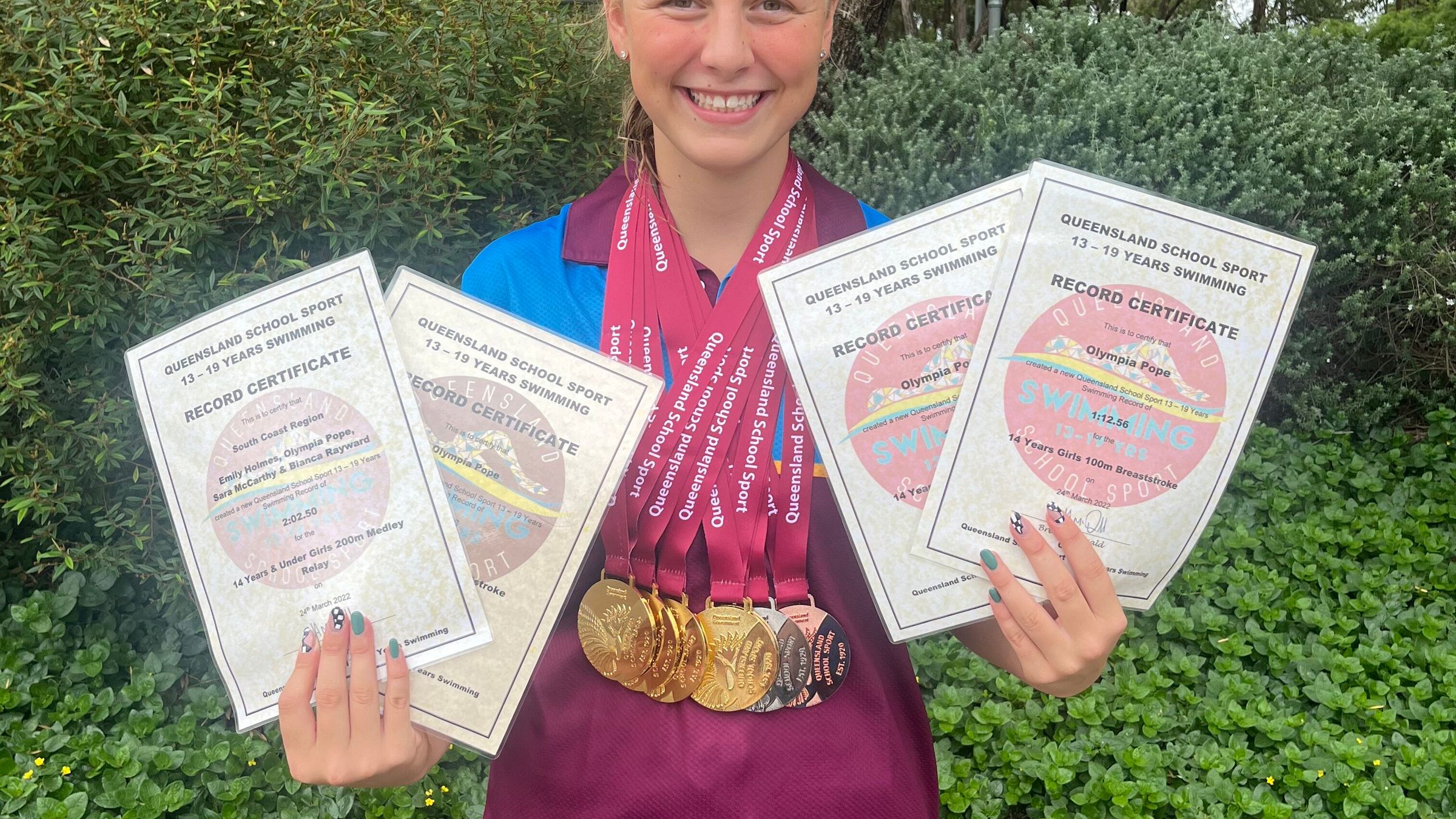 Olympia Pope (14 years) – State Champion in 50m, 100m, 200m Breaststroke breaking the Queensland record in the 100m and 200m Breaststroke.