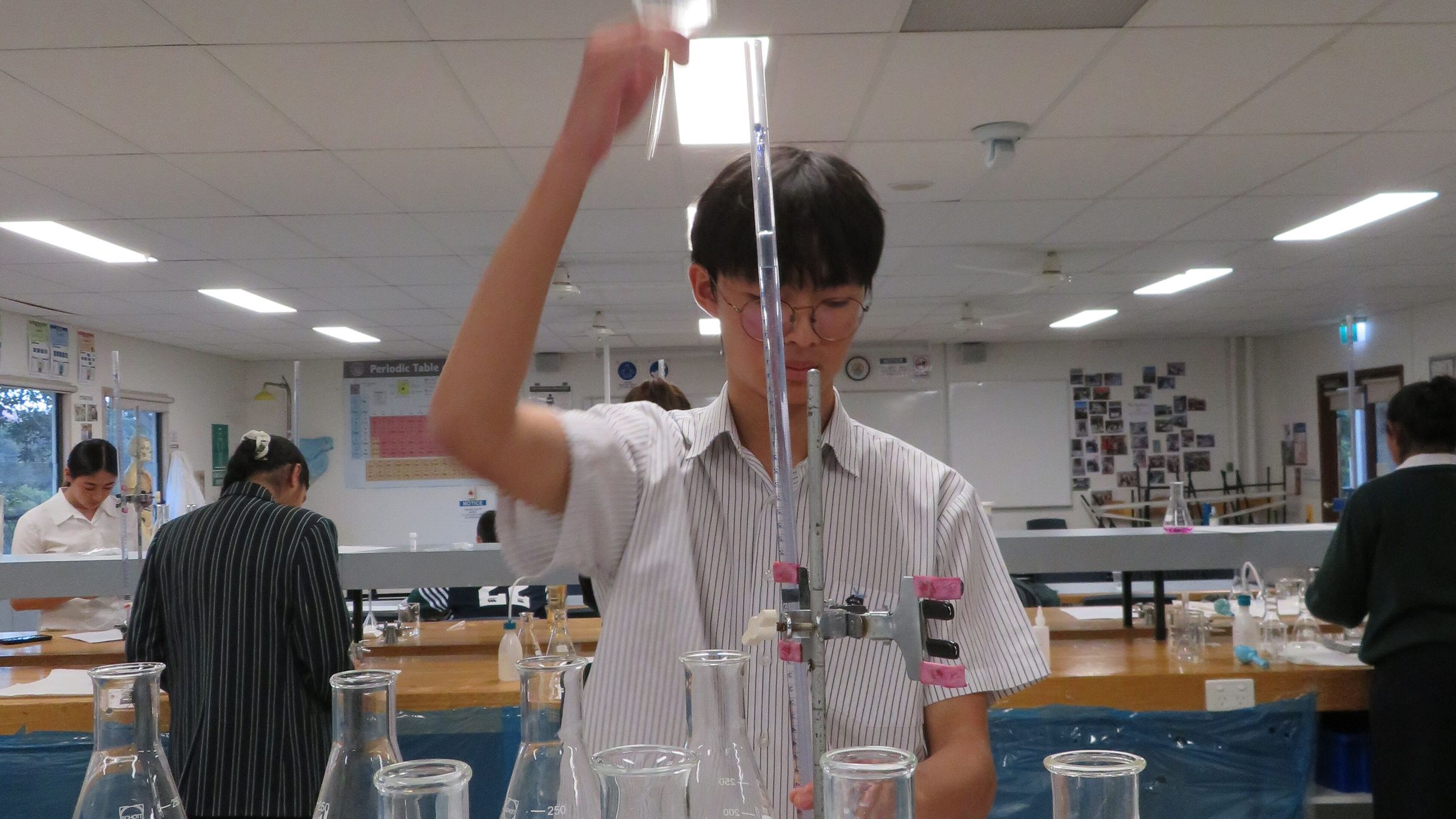 The annual RACI (Royal Australian Chemistry Institute) Titration Competition is a highlight on the Science Committee calendar and this year we entered the largest number of teams yet. Titration is an Analytical Chemistry technique used to determine the concentration of an unknown solution. It is used in almost all branches of Chemistry and is actually used quite commonly in everyday life, for example, wine making and water testing in swimming pools is based on titrations. The goal of the competition is to determine the exact number of moles of an unknown substance. It is a test of accuracy, precision and patience. Students with the least error in their final value are the most successful. While all students showed commitment to their training this year and developed expertise in the technique, there were a few students who excelled.