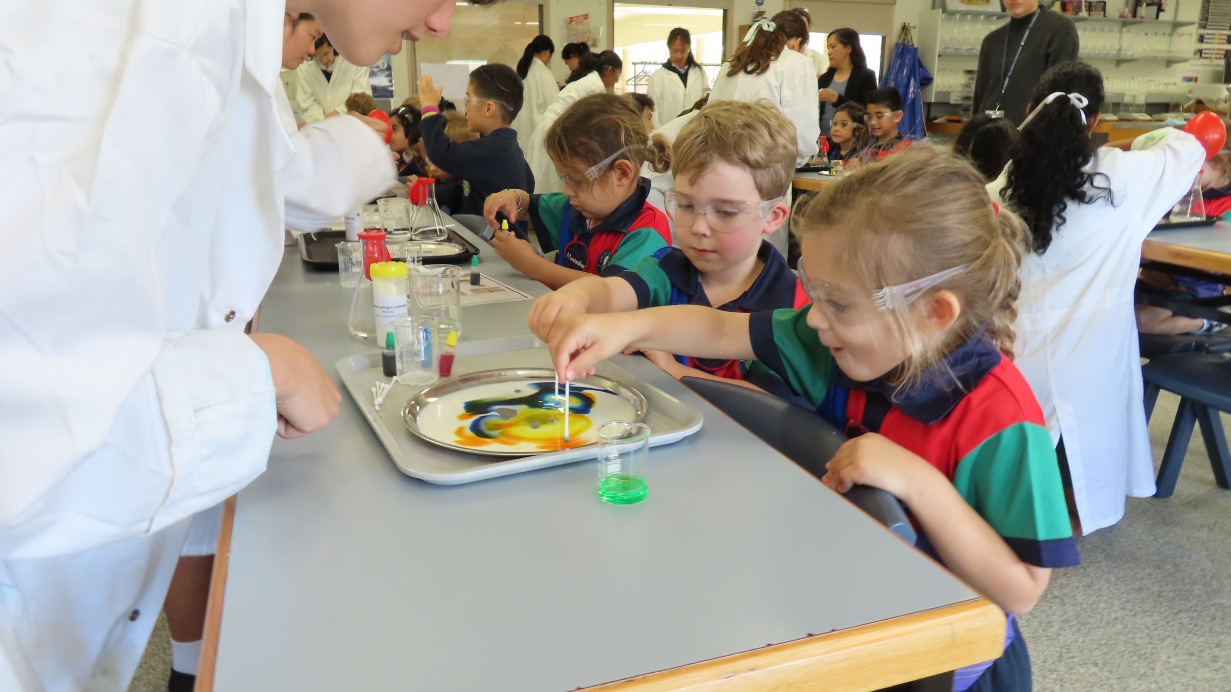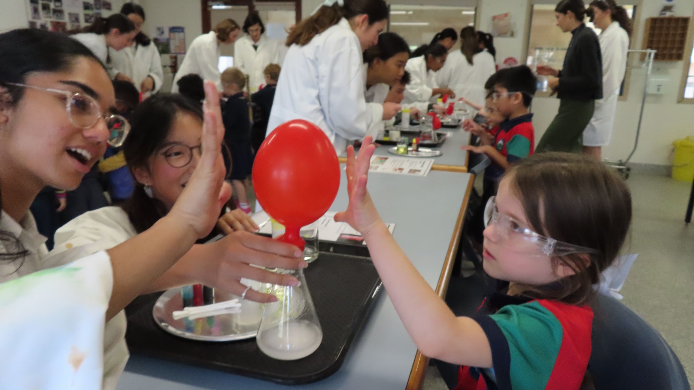 Our Pre-Prep Red class enjoyed an exciting visit to the Senior School Science lab during Science Week. The Senior Science Committee students generously gave up their lunchtime to give some demonstrations and help the Pre-Preps try some of their own experiments.