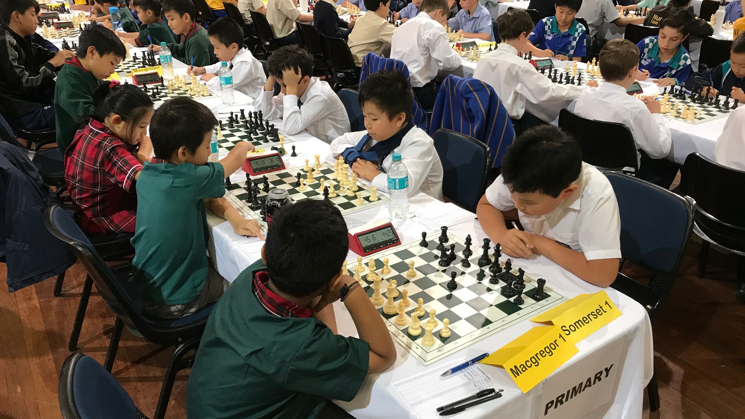 The culmination of every year’s Queensland Interschool Chess Championship is the “State Finals”. Over 1,000 teams from across every corner of Queensland compete all year in the gruelling qualifying stages, and last weekend there were a record number of finalists: 38 teams in Primary, and 18 in Secondary.
