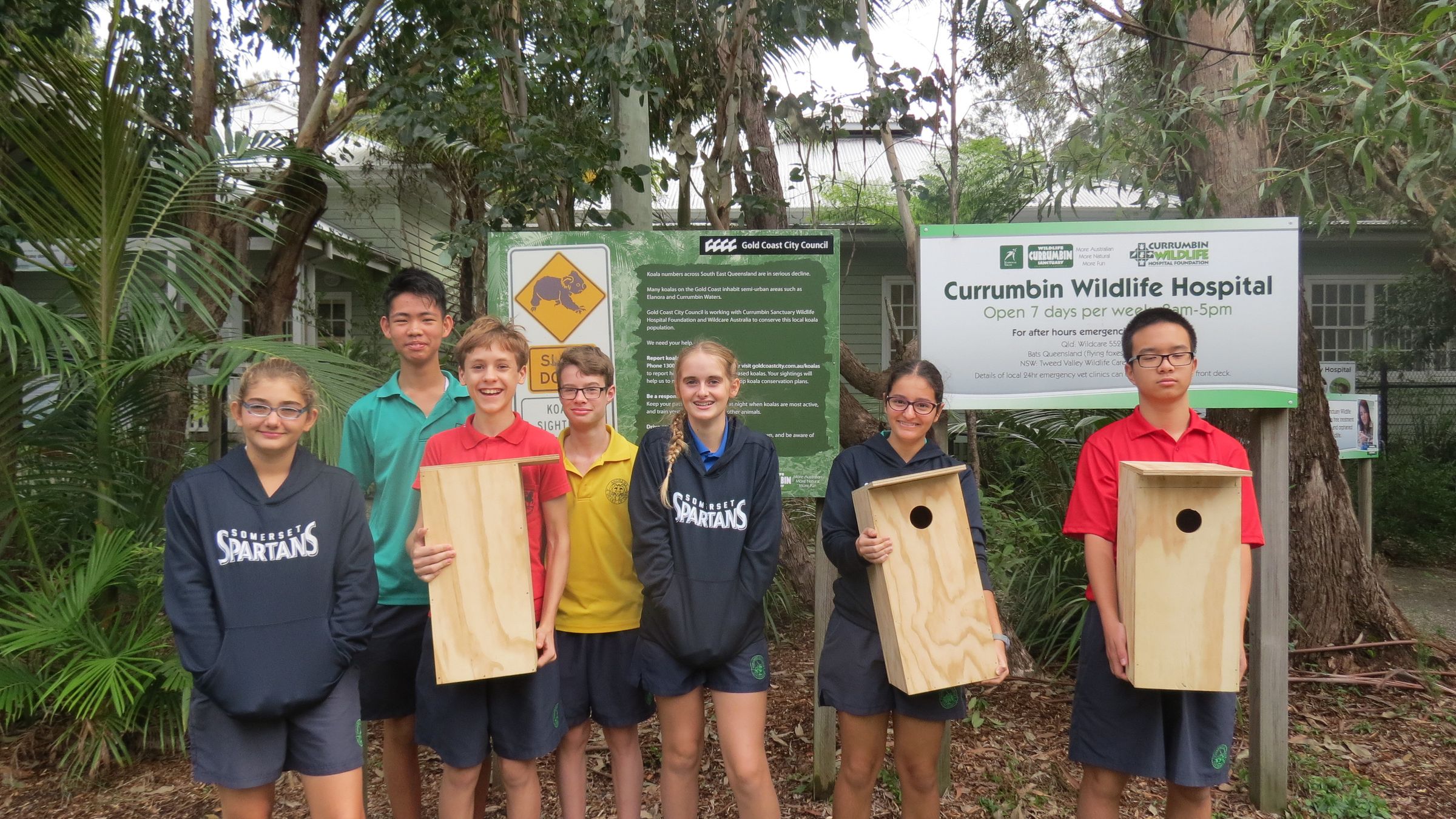 Throughout Term 1 a group of Year 8 students participated in the Somerset Shed program, meeting every Monday lunchtime to work on creating Nesting boxes to be donated to the Currumbin Wildlife Hospital. After several weeks of cutting, hammering and making sure the bits of timber lined up, we were ready to deliver these.